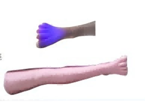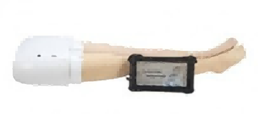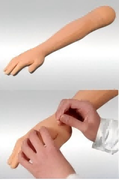 模拟一成人手臂;手臂外皮采用高仿真性材质制作,有皮肤纹理,触之柔软,手感真实;设有仿真的骨骼包括:尺骨、挠骨、尺骨鹰嘴等;可以进行上肢常用穴60余个如合谷、曲池、列缺及上肢五腧穴等穴位的定位及针刺示教、练习及考核;可以进行多种针刺方法的训练,针刺手感较为真实;各穴位采用隐性标记方法,可在训练或考核中根据需要有选择的显现标记的穴位,也可对穴位的定位及针刺进行检测。